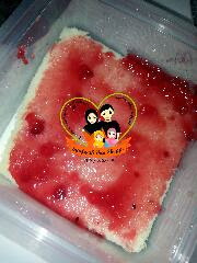 Bawah sekali letak cream cheese. Layer yg kedua letak sponge cake yg dah dipotong tadi. Layer ketiga sapu jem.